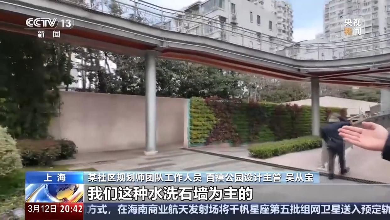 上海某社区规划师团队工作人员 百禧公园设计主管 吴从宝:这边我们是通过一些钢构镂空,这个形式是最通透的,因为旁边是开放大学,属于公共机构。也有像这侧这种水洗石墙为主的,比较私密性强的阻隔设计,这是充分尊重居民的意愿基础上的方案。