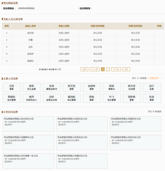 国家企业信用信息公示系统显示,中达安股份有限公司成立于2000年,注册资本14013.4万元人民币,法定代表人陈天宝。