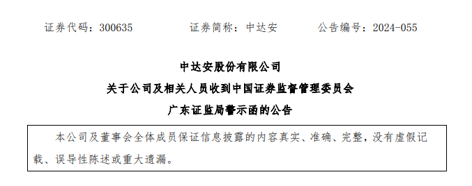 此外,中达安曾在2024年8月16日公告,公司及相关人员收到中国证券监督管理委员会广东证监局警示函。内容显示,广东证监局现场检查发现,该公司存在财务核算不准确、公司信息披露不准确的问题。同年8月30日,中达安发布警示函所涉问题的整改报告,中达安表示,经过全面梳理与自查,公司深刻认识到了在财务核算、信息披露等方面存在的问题与不足,后续将不断完善公司治理和内部控制体系,强化监督执行等。