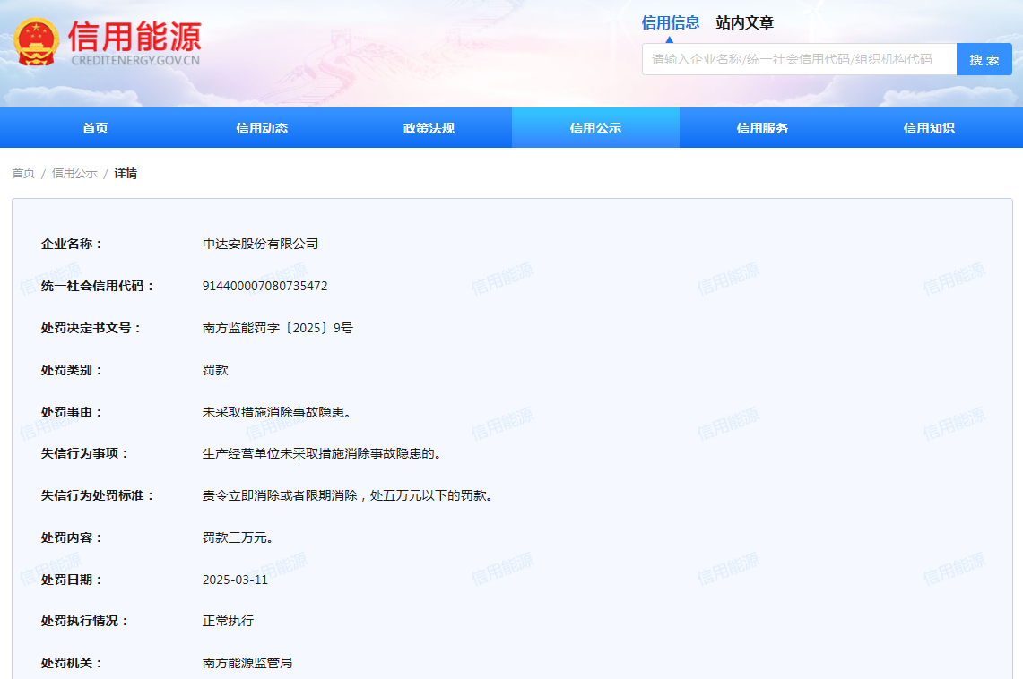 内容显示,中达安的失信行为事项是:生产经营单位未釆取措施消除事故隐患的。南方能源监管局依照有关规定,对其罚款三万元,处罚日期是3月11日。处罚决定书文号:南方监能罚字〔2025〕9号。