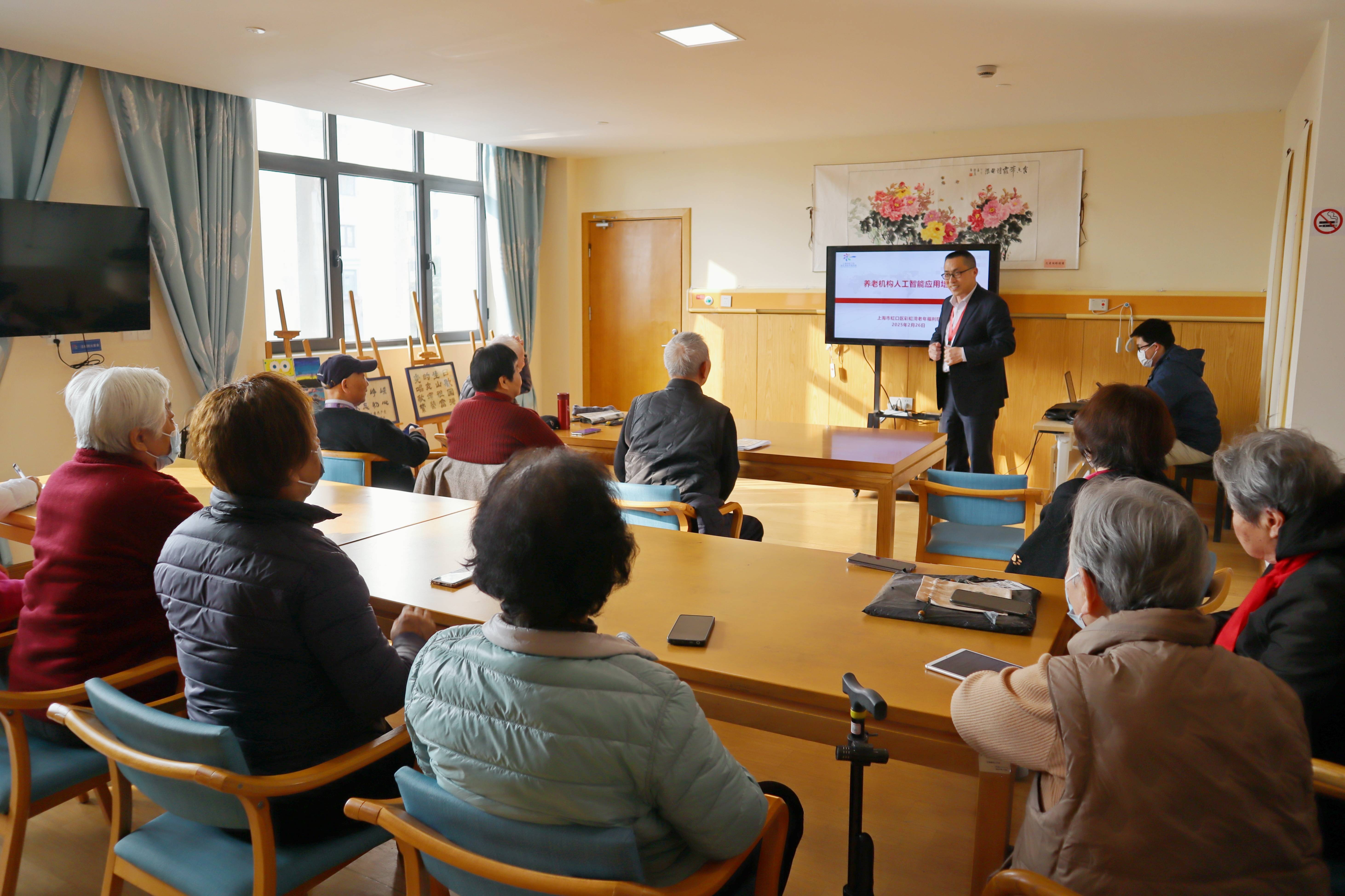 这是初春午后上海市虹口区彩虹湾老年福利院活动室里的一幕。20多名银发“学员”围坐在一起,听这家老年福利院的院长邓明星讲解AI大模型应用DeepSeek的用法。