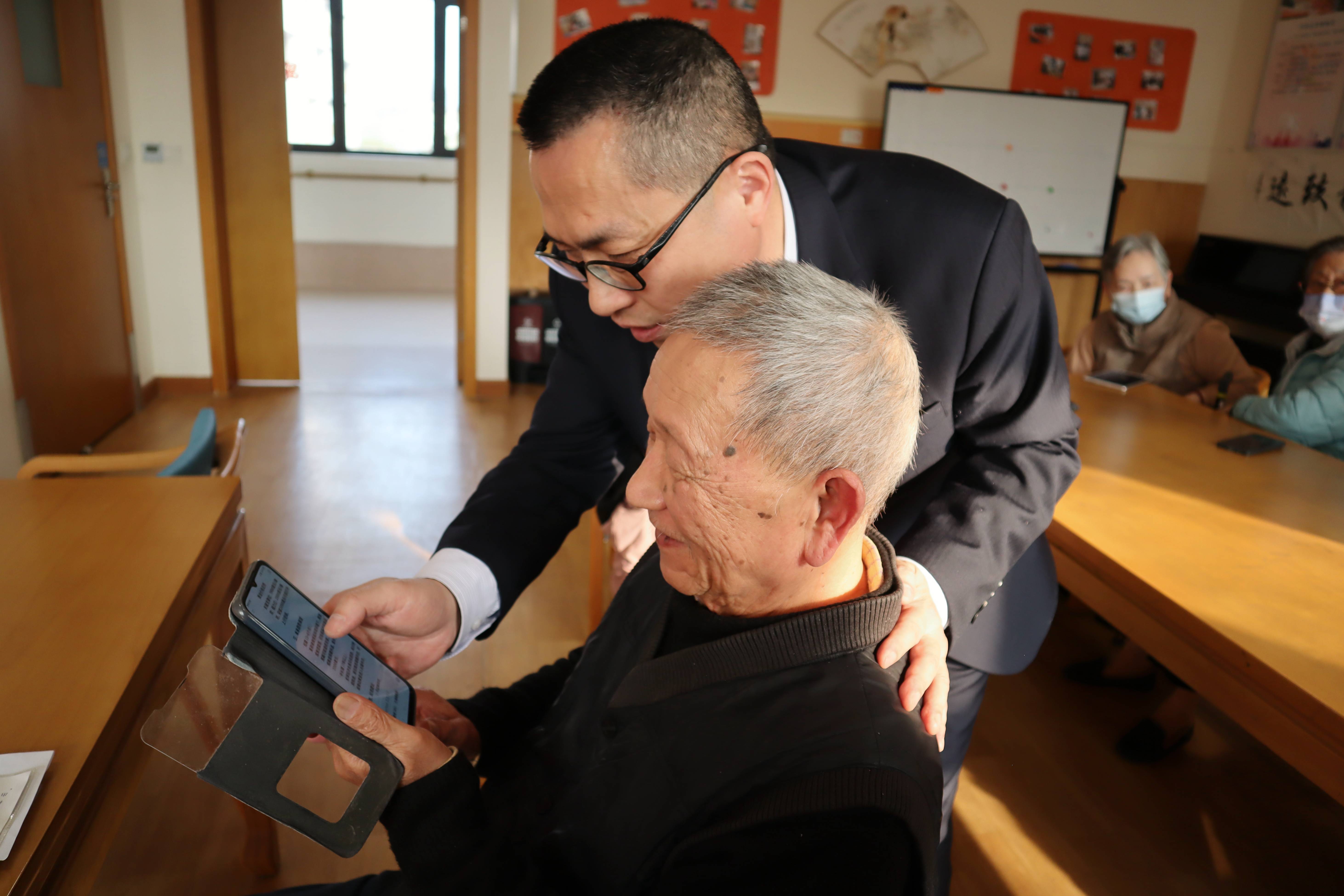 上海市虹口区彩虹湾老年福利院院长邓明星(后)在教授老人滕泉大(前)AI的使用方法(2月26日摄)。新华社记者 唐斯琦 摄