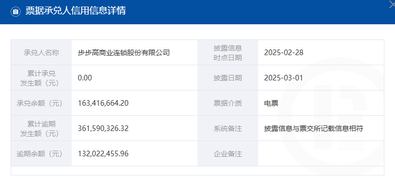 其中,步步高商业连锁股份有限公司承兑余额163416664.20元,累计逾期发生额361590326.32元,逾期余额132022455.96元,披露信息时点日期为2025年2月28日,披露日期为2025年3月1日。