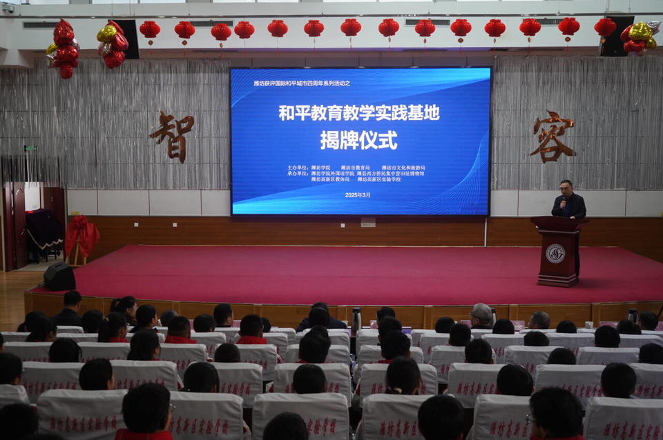 3月14日,和平学进校园启动仪式暨“馆校共融:和平学理论研讨会”在潍坊高新区实验学校举办。此次活动由潍坊学院、潍坊市文化和旅游局、潍坊市教育局主办,潍坊学院外国语学院、潍县西方侨民集中营旧址博物馆、潍坊高新区教体局、潍坊高新区实验学校承办。