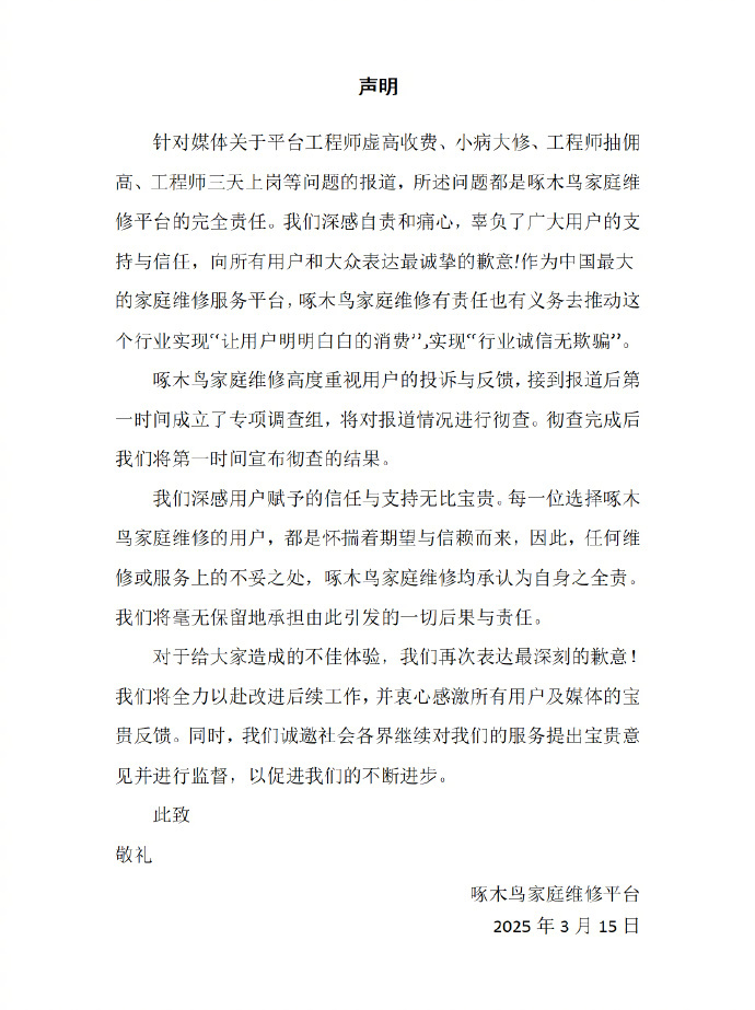 啄木鸟维修就315晚会曝光道歉 央视财经微博 2025-03-15 3.5万 今天,#315晚会#曝光维修刺客啄木鸟,只打开水龙头,收费100元。刚刚,啄木鸟家庭维修官方微博道歉,称已成立专项调查组,将对报道情况进行彻查。彻查完成后,第一时间宣布彻查结果。 (央视财经微博) 责任编辑:朱洪蕾