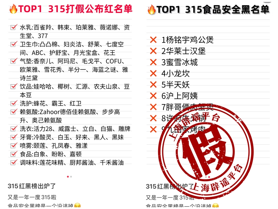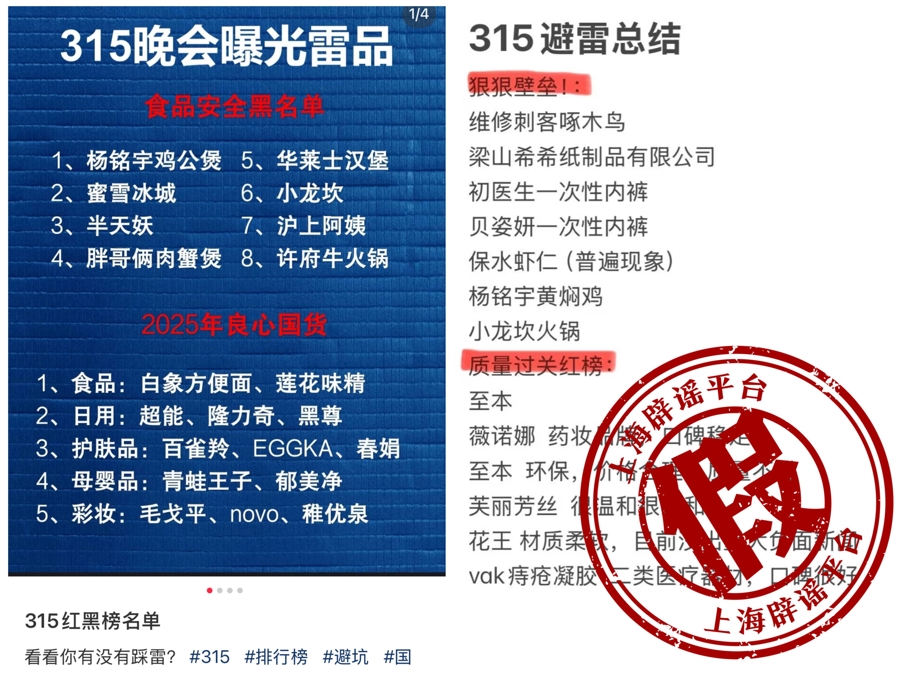 2025年央视“3·15”晚会落幕后,针对被曝光的违法行为,市场监管部门等迅速开展行动,依法处置曝光问题。但上海辟谣平台注意到,社交平台出现了很多“热心监督员”,看似贴心地整理了“315红黑榜”,一边提醒他人提防“黑榜”里的品牌,另一边又表示“红榜”里的品牌可以放心消费。可是,这些榜单漏洞百出,绝大多数与央视“3·15”晚会没有任何关系,而是部分营销号蹭“3·15”热点,以“打假”之名行“造假”之实。