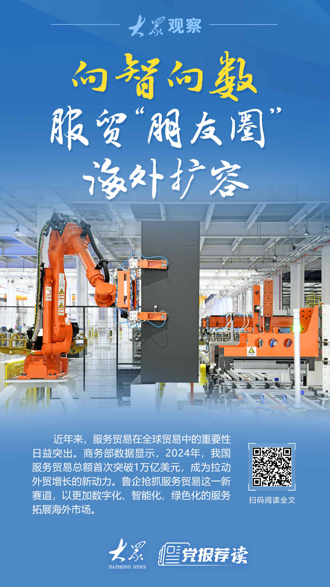 近年来,服务贸易在全球贸易中的重要性日益突出。商务部数据显示,2024年,我国服务贸易总额首次突破1万亿美元,成为拉动外贸增长的新动力。鲁企抢抓服务贸易这一新赛道,以更加数字化、智能化、绿色化的服务拓展海外市场。