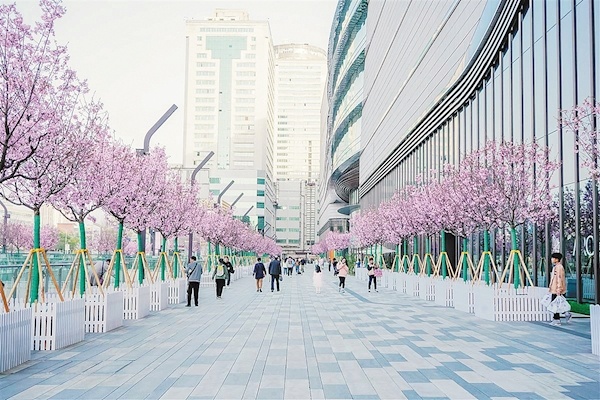 在武商梦时代广场上,大批樱花悄然亮相,市民游客无需进景区,在商圈即可赏樱打卡、购物娱乐,一举多得。