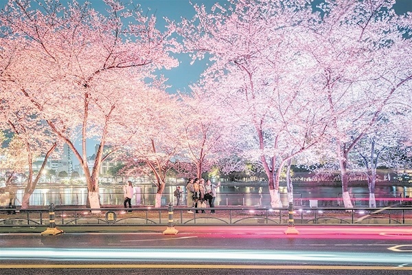 作为武汉最长的樱花大道,洪山江滩樱花大道上起白沙洲大桥,下至杨泗港大桥,道路两侧共栽植樱花700株。