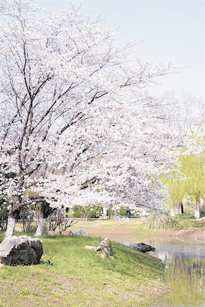这里主要栽种有染井吉野、大岛、野山樱等品种。值得一提的是,青山公园里还栽种有樱花界的娇贵品种——郁金樱。绿色樱花绽满枝头,被称作“大熊猫绿樱”。