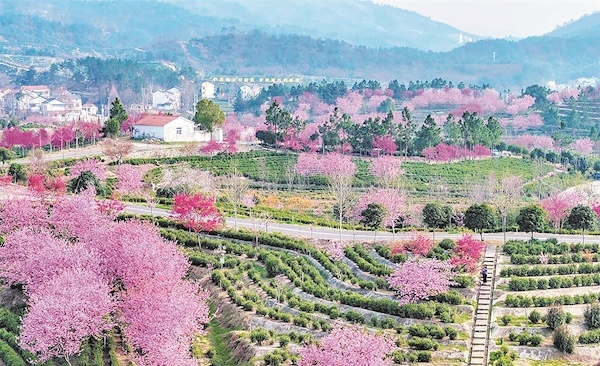 近日,新洲旧街街问津茶苑茶山上的早樱已经盛开,茶园绽放着春的气息。
