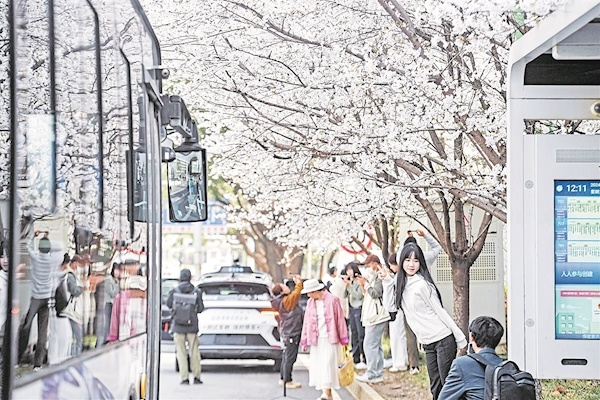 每到3月中下旬,环绕站台的10余棵樱花树繁花朵朵。公交站内外,等候公交车的人们,慕名而来的赏花人,喜欢掏出手机拍照打卡。