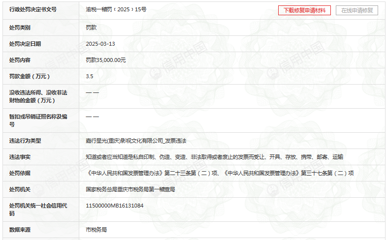 齐鲁晚报·齐鲁壹点记者于信用中国官方网站了解到,近日,嘉行传媒旗下的嘉行星光(重庆)影视文化有限公司因发票违法被罚。