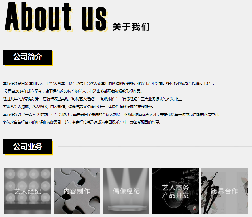 据嘉行传媒官方网站介绍,嘉行传媒是一家新兴多元化娱乐产业公司,旗下拥有近50位全约艺人,其签约艺人包括迪丽热巴、张云龙、高伟光等。