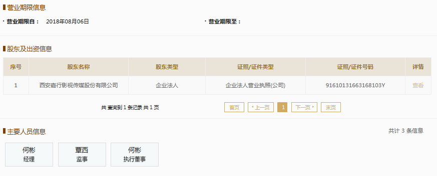国家企业信用信息公示系统显示,嘉行星光(重庆)影视文化有限公司成立于2018年,注册资本500万元人民币,法定代表人为何彬,由西安嘉行影视传媒股份有限公司全资持股。西安嘉行影视传媒股份有限公司则成立于2007年,注册资本2000万元人民币,法定代表人为曾嘉。