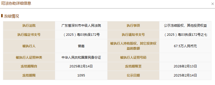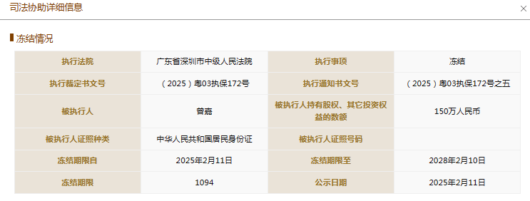 此外,今年2月,在国家企业信用信息公示系统中,两条有关曾嘉的股权冻结信息被公示,股权被执行的企业分别为井冈山嘉行悦美企业管理合伙企业(有限合伙)、海南悦意商务服务合伙企业(有限合伙),冻结股权数额分别为150万元、67.5万人民币,冻结期限均为3年,执行法院为广东省深圳市中级人民法院。