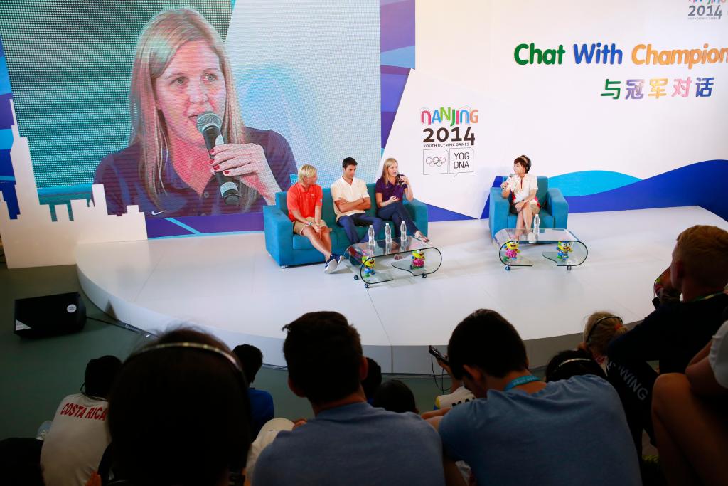 2014年8月25日,南京青奥会最后一场“与冠军对话”活动在青奥村举行。游泳奥运冠军、津巴布韦名将考文垂等与各国年轻运动员进行了面对面的交流。新华社记者 任正来 摄