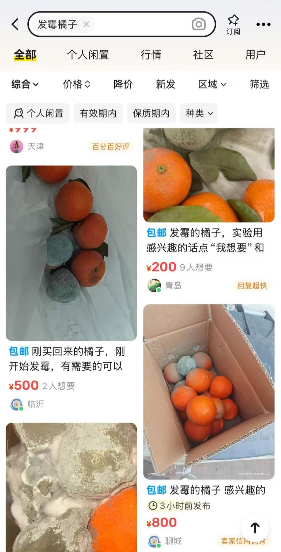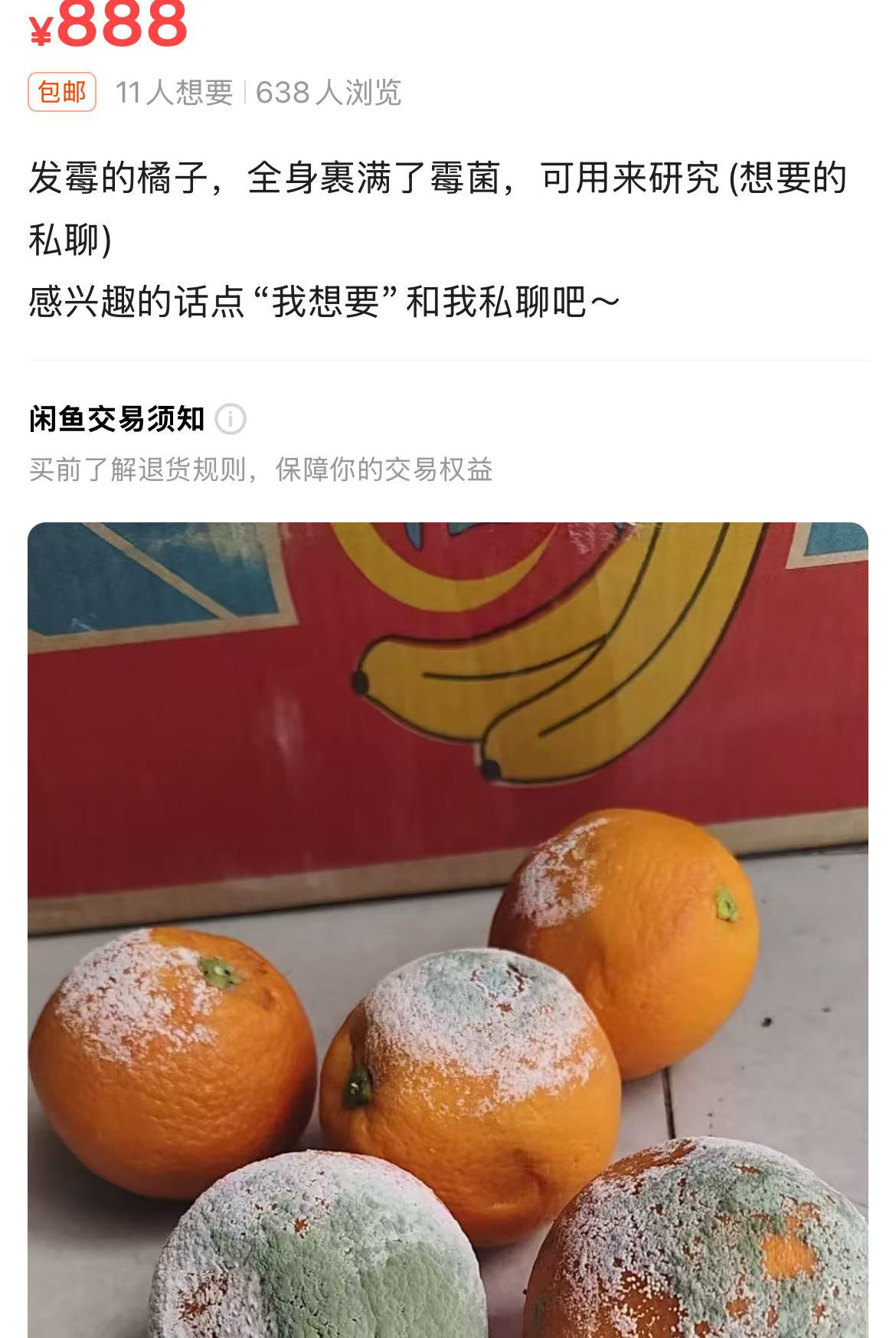 此类发霉的商品潜在买家可能来自学校,他们以为能通过购买发霉橘子,便捷获取实验材料,用于观察霉菌生长过程、研究微生物特性等实验。但他们往往忽略了,二手平台售卖的发霉橘子来源不明,其霉菌种类和生长状态未经专业检测,用于实验可能导致实验结果偏差。