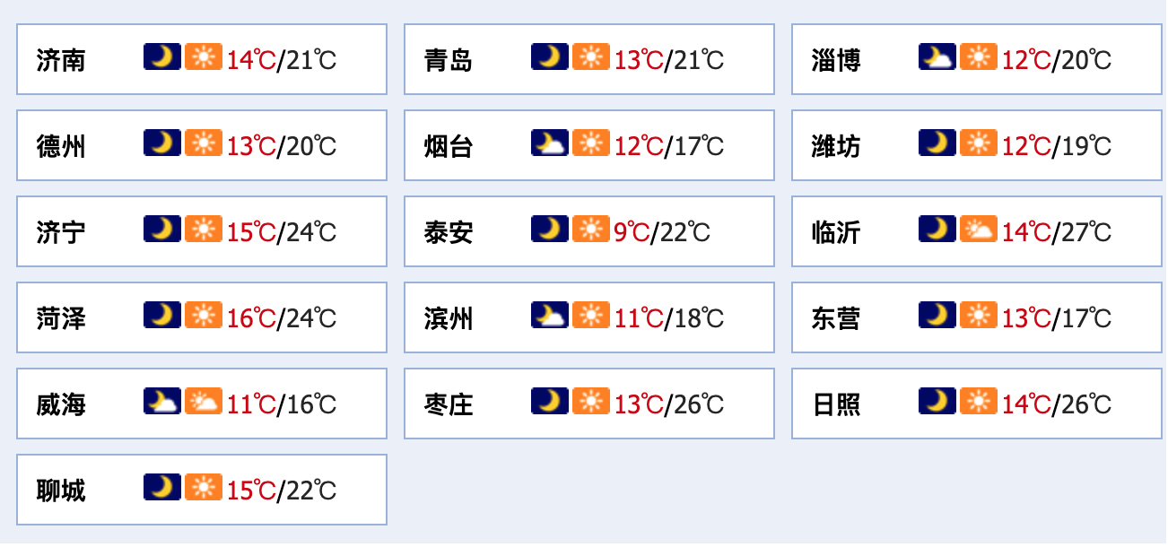 最高气温:鲁南地区25℃左右,鲁中山区和北部沿海地区18℃左右,其他地区21℃左右。