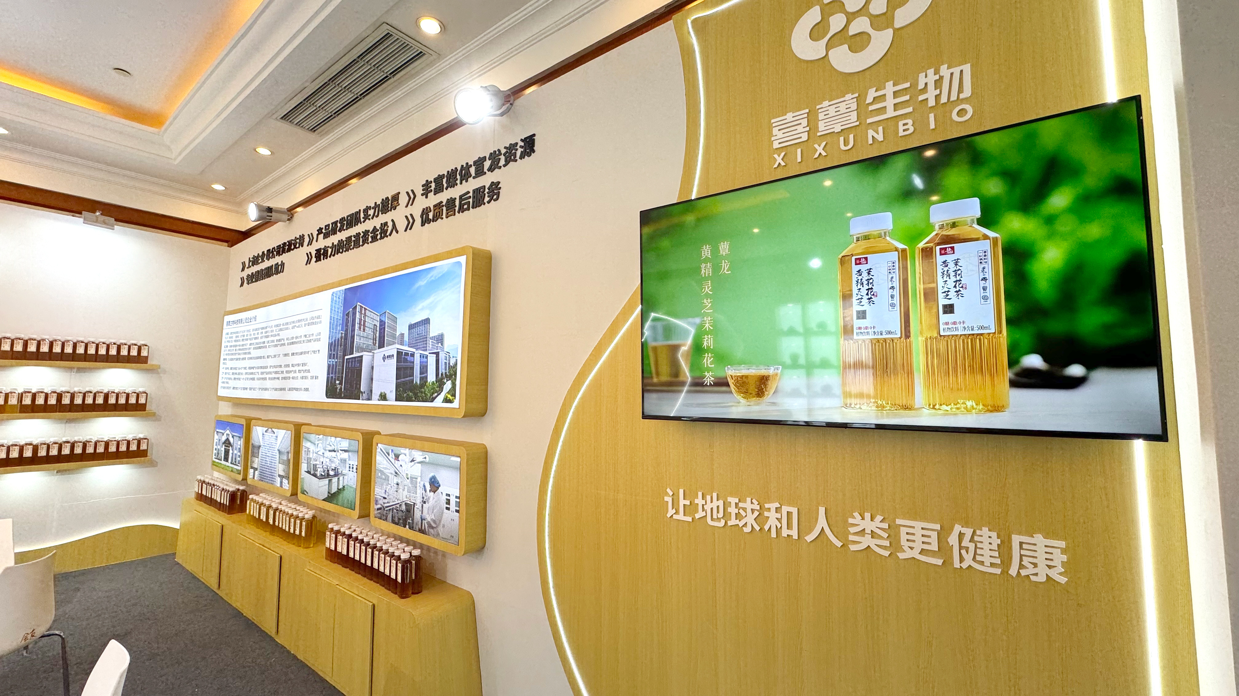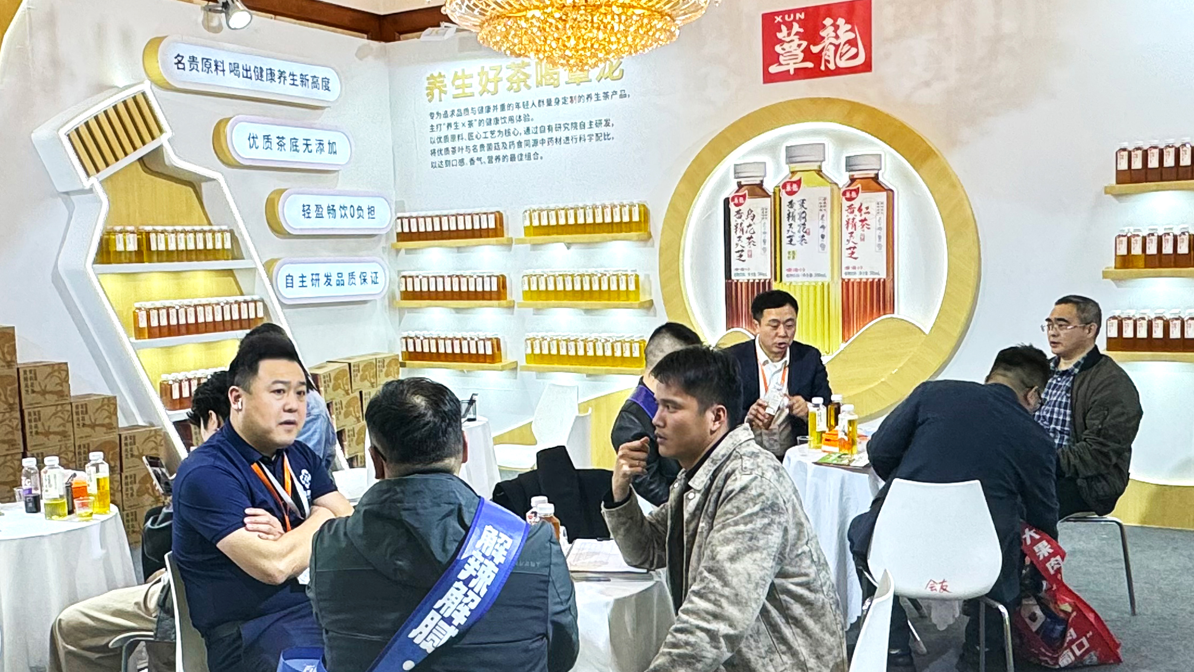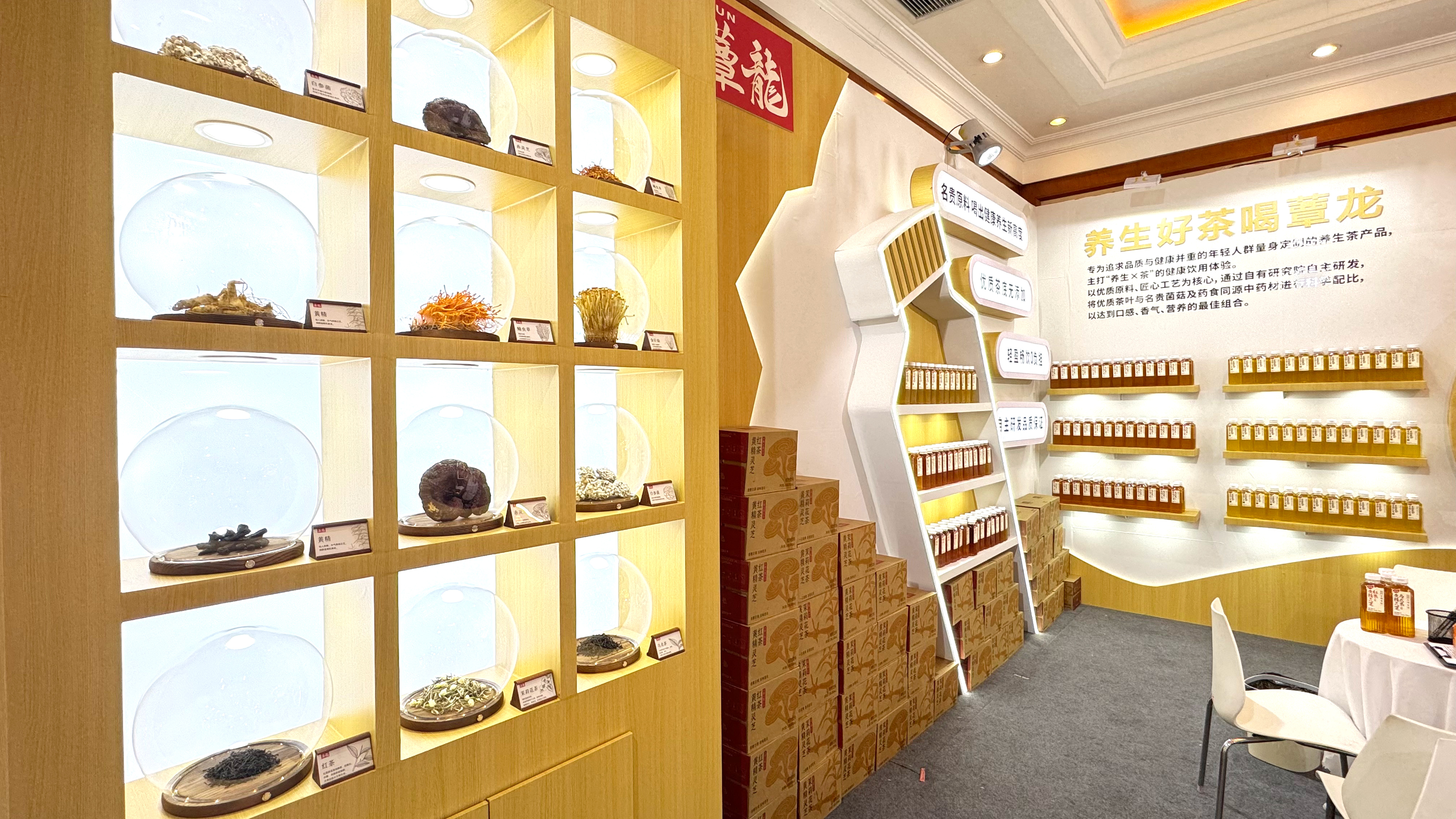 蕈龙在展位搭建上可谓用心十足,原木框架搭配暖色光影,每一处细节都在传递自然养生的力量。蕈龙养生茶系列三大产品「黄精灵芝茉莉花茶」「黄精灵芝乌龙茶」「黄精灵芝红茶」陈列于C位,黄精、赤灵芝等经典原料摆放在侧,观众可现场直观感受蕈龙养生茶系列满满的真材实料。