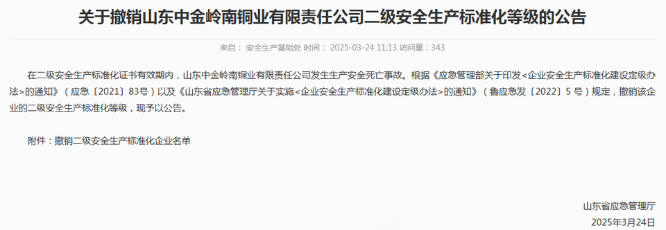 3月24日,山东省应急管理厅发布消息称,撤销山东中金岭南铜业有限责任公司二级安全生产标准化等级。
