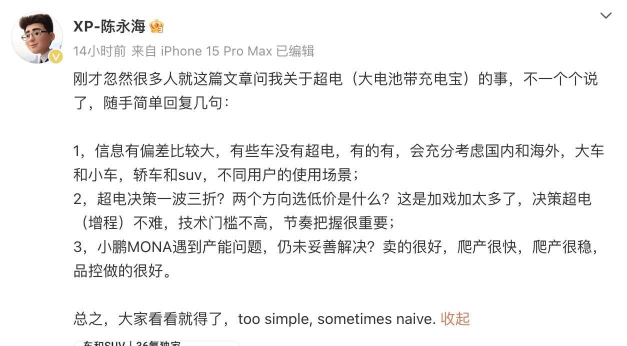 对此,小鹏汽车副总裁陈永海在社交媒体上表示:“(报道)信息有偏差(且)比较大。有些车没有超电(增程),有的有。(是否使用超电)会充分考虑国内和海外,大车和小车,轿车和SUV,不同用户的使用场景(等因素)。”