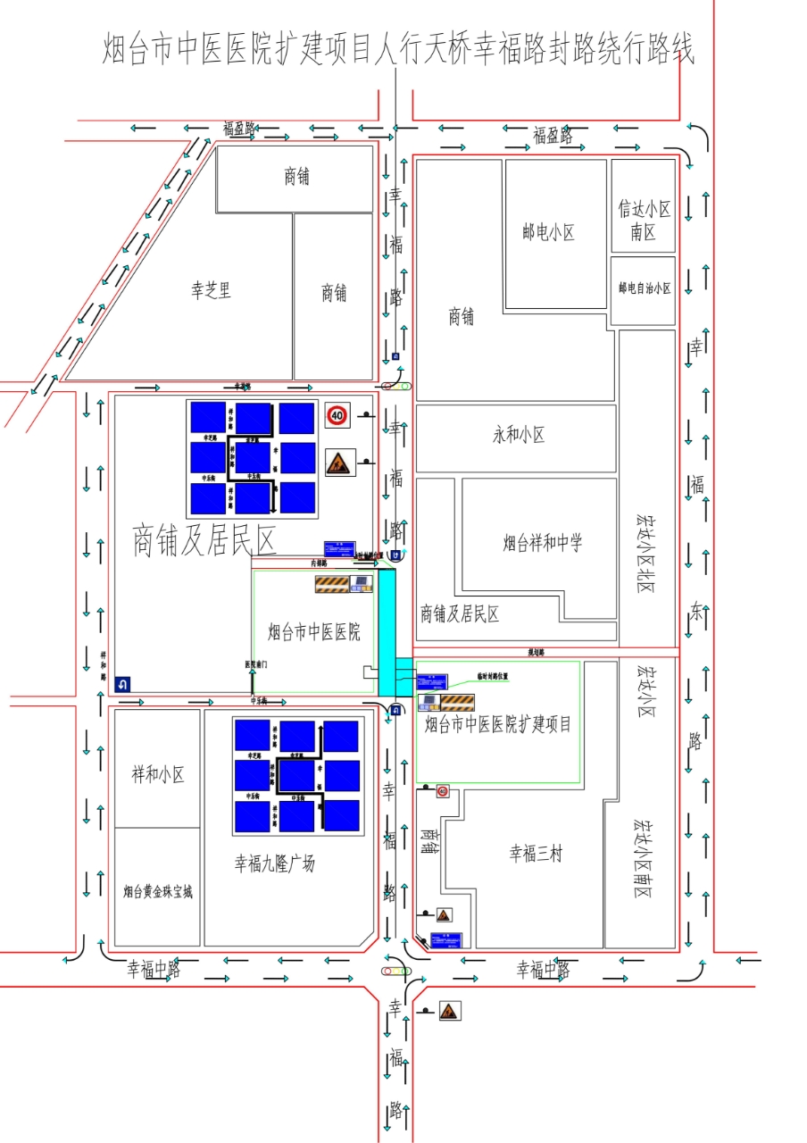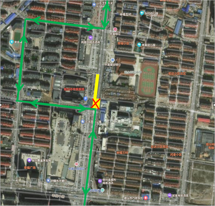道路全封闭期间,由南向北的车辆无法从烟台市中医医院东门进入医院,需绕行至烟台市中医医院南门进入,具体路线为:幸福路-中乐街-烟台市中医医院南门