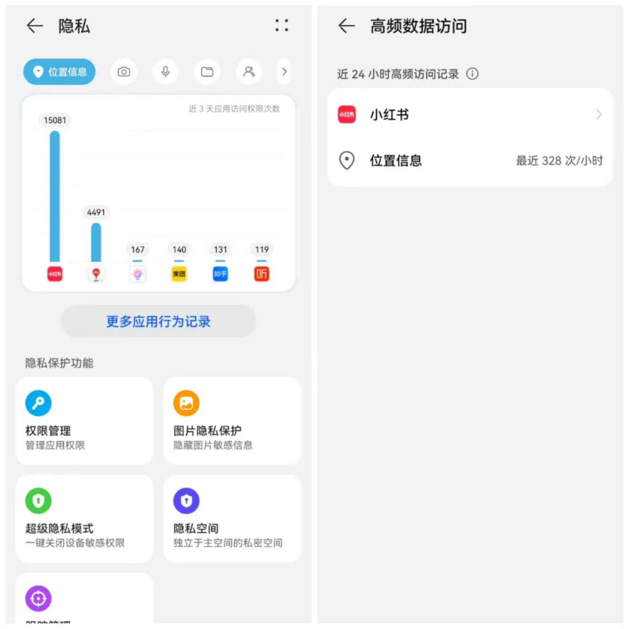 济南市民张女士看到这个新闻后,发现自己同样也遭到了小红书“袭击”。其中,近三天手机被小红书仅调用位置信息就,调用了15081次。而点开在近24小时高频访问记录里显示,调用位置信息328次/小时。