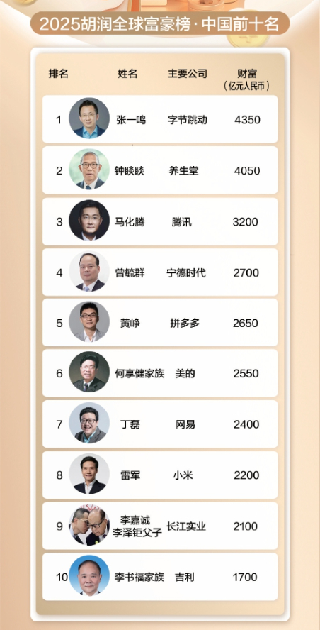 《2025胡润全球富豪榜》公布:张一鸣成中国新首富