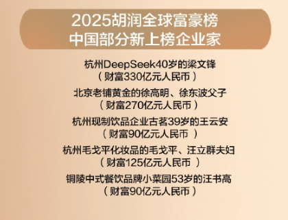 今年中国共有91位新上榜企业家。包括:杭州DeepSeek40岁的梁文锋,财富330亿元;北京老铺黄金的徐高明、徐东波父子,财富270亿元;最近新上市的杭州现制饮品企业古茗39岁的王云安,财富90亿元;杭州毛戈平化妆品的毛戈平(61岁)、汪立群(54岁)夫妇,财富125亿元;铜陵中式餐饮品牌小菜园53岁的汪书高,财富90亿元。(济南时报·新黄河客户端记者高莹)