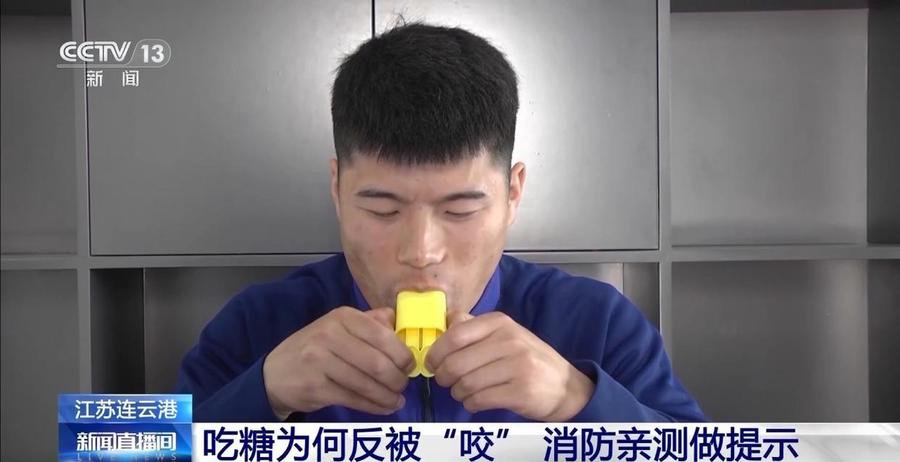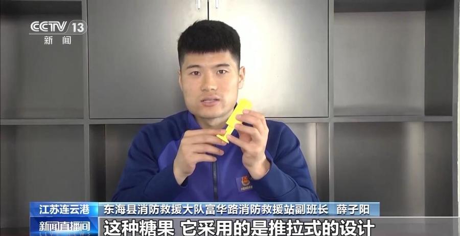 东海县消防救援大队富华路消防救援站副班长 薛子阳:这种糖果采用的是推拉式的设计,类似于针管的原理。我们在食用过程中需要推动这个推杆,将里面的糖果挤出来。由于摩擦力比较大,我刚才在体验的过程中也感到非常费力。这对于一个成年人来讲都需要很大的力气,更何况对于一个未成年的小朋友来说。他在推不动、吸不出的情况下,就会出现咬食塑料外壳的情况,从而导致塑料外壳的破裂,出现夹舌头以及夹两侧腮部的安全风险。