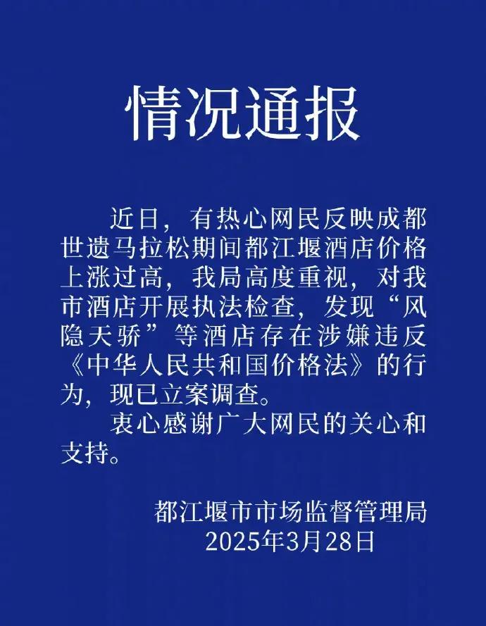 3月28日,四川都江堰市市场监督管理局通报,有网民反映成都世遗马拉松期间,都江堰酒店价格上涨过高,检查发现“风隐天骄”等酒店存在涉嫌违反《中华人民共和国价格法》的行为,现已立案调查。