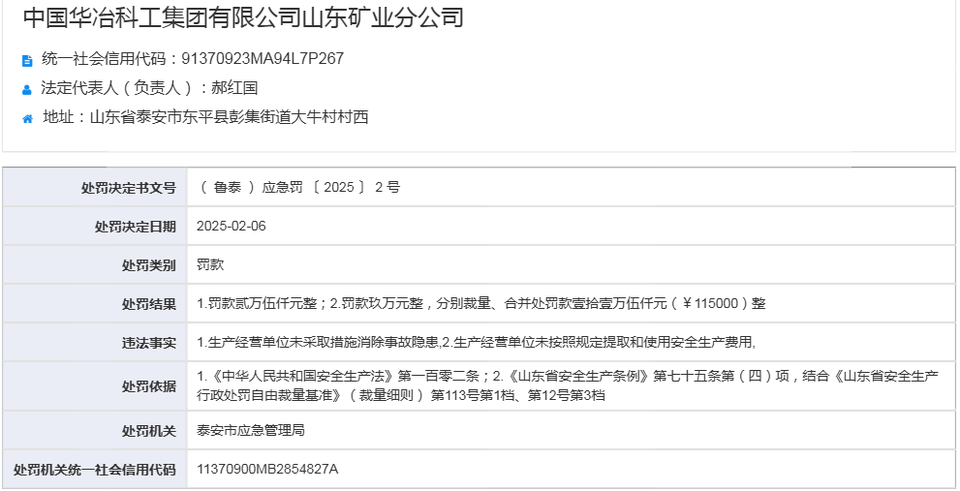 中国华冶科工集团山东矿业分公司被罚11.5万元