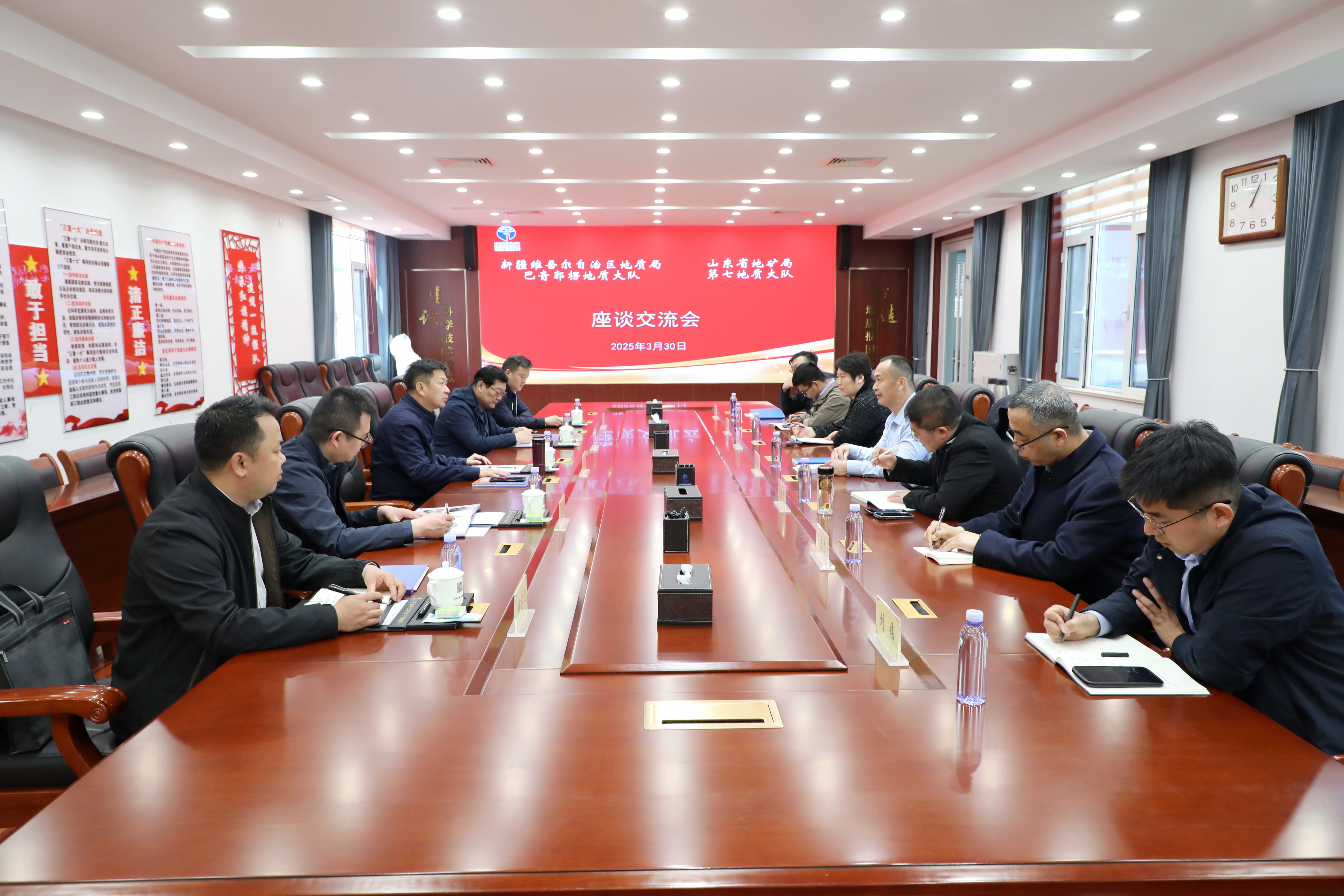 3月30日,新疆维吾尔自治区地质局巴音郭楞地质大队党委书记、副大队长王敬国一行5人,到山东省地矿局第七地质大队考察交流,省地矿局第七地质大队党委书记、队长李兆营陪同考察,队党委委员孙永胜主持座谈交流。