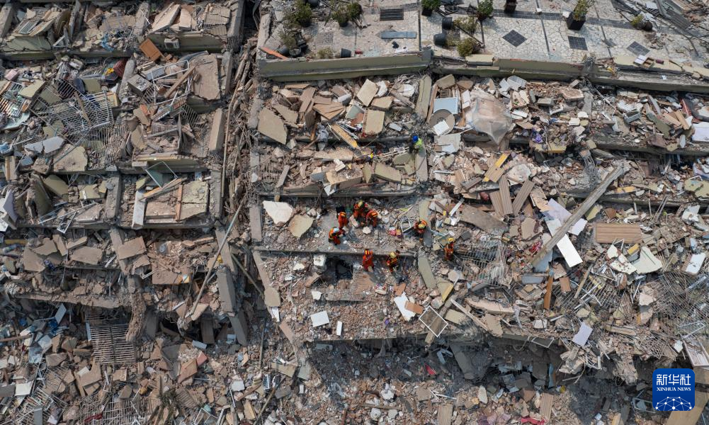 4月1日上午,中国救援队和中国香港特区救援队再次来到缅甸曼德勒天空公寓开展联合搜救(无人机照片)。