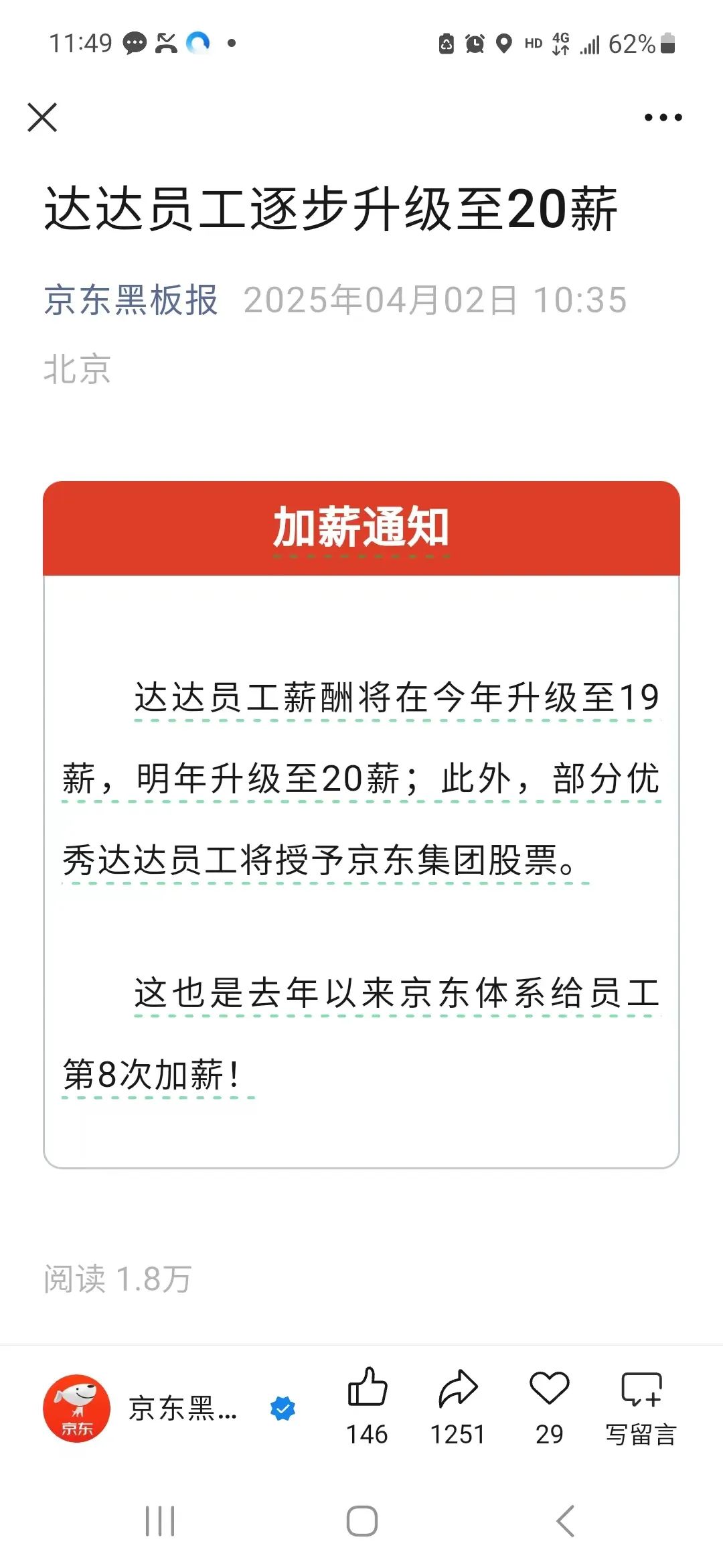 4月2日,据京东黑板报消息,达达员工薪酬将在今年升级至19薪,明年升级至20薪;此外,部分优秀达达员工将授予京东集团股票。这也是去年以来京东体系给员工第8次加薪。