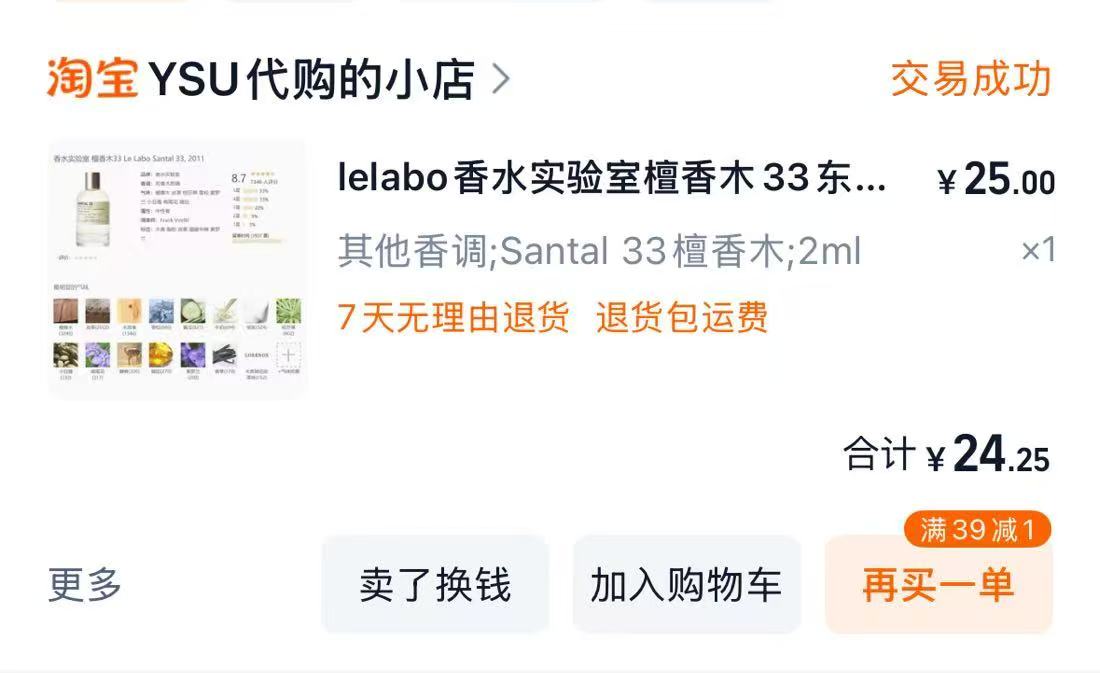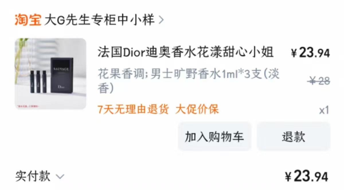 随后,王女士又在淘宝一家专卖中小样的店铺花费28元(实付款23.94元)购买了同一品牌3ml的试用装,如果不用优惠券,每毫升平均9.3元。