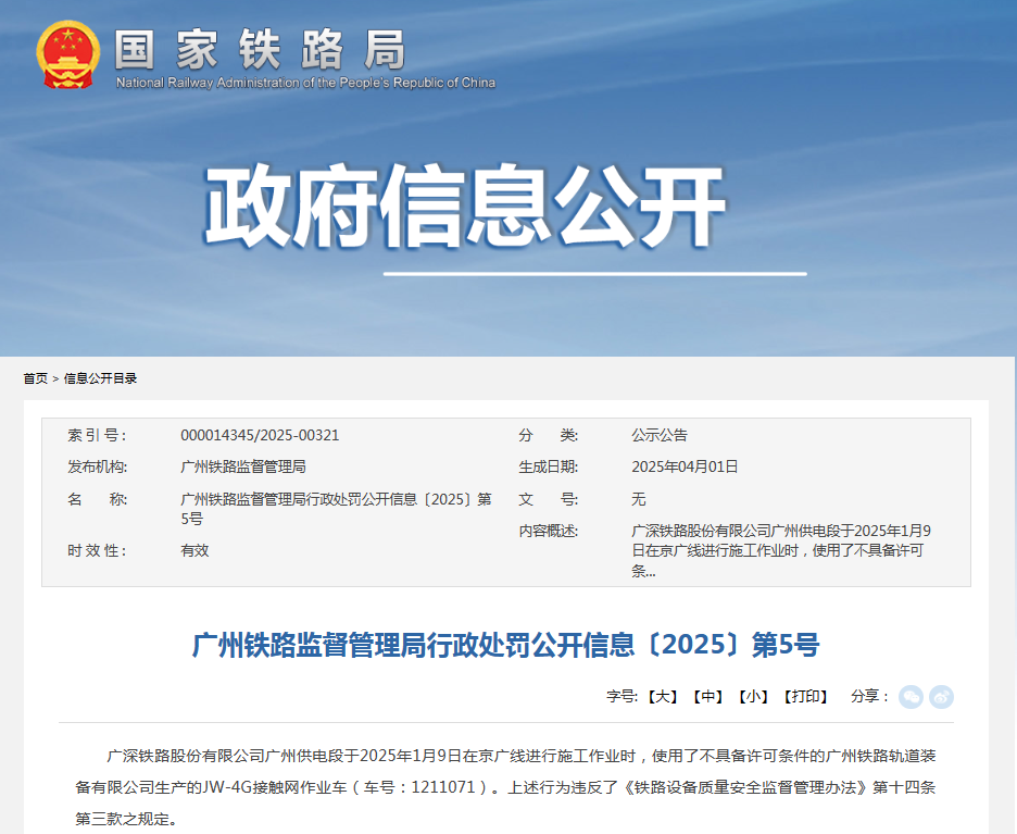 齐鲁晚报·齐鲁壹点记者于国家铁路局官网了解到,4月1日,其信息公开栏公示了广州铁路监督管理局行政处罚公开信息〔2025〕第5号。据悉,被行政处罚的单位为广深铁路股份有限公司广州供电段。