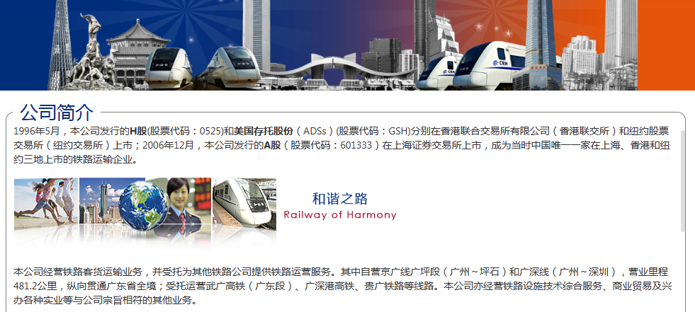 此外,1996年5月,该公司发行的H股(股票代码:0525)和美国存托股份(ADSs)(股票代码:GSH)分别在香港联合交易所有限公司(香港联交所)和纽约股票交易所(纽约交易所)上市;2006年12月,该公司发行的A股(股票代码:601333)在上海证券交易所上市,成为当时中国唯一一家在上海、香港和纽约三地上市的铁路运输企业。