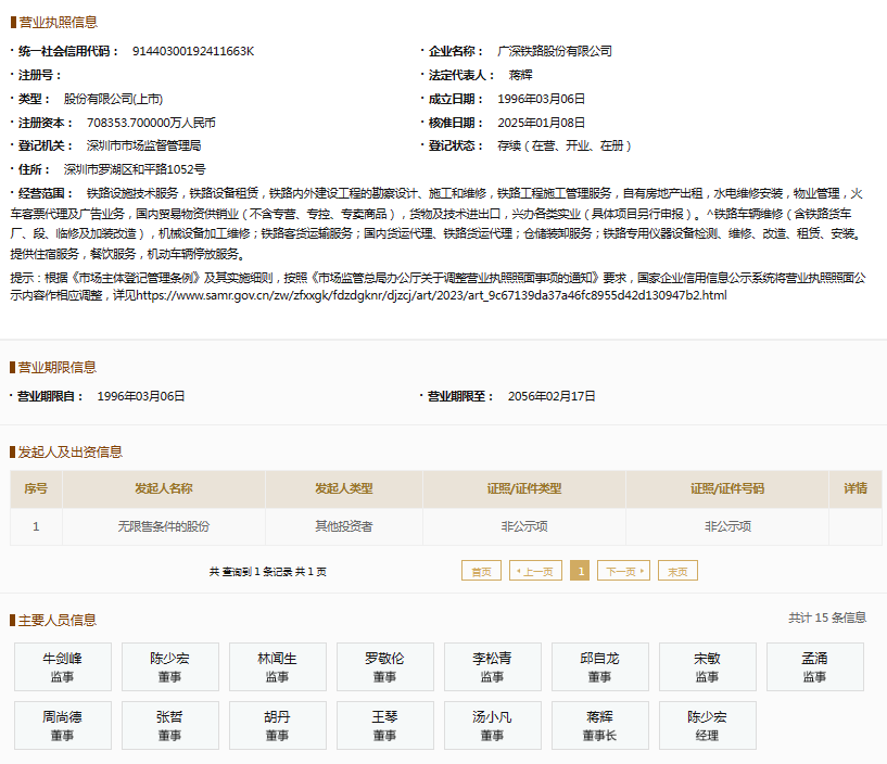 国家企业信用信息公示系统显示,广深铁路股份有限公司广州供电段成立于2014年,负责人为余志坚,总公司为广深铁路股份有限公司。广深铁路股份有限公司则成立于1996年,注册资本708353.7万元人民币,法定代表人为蒋辉。