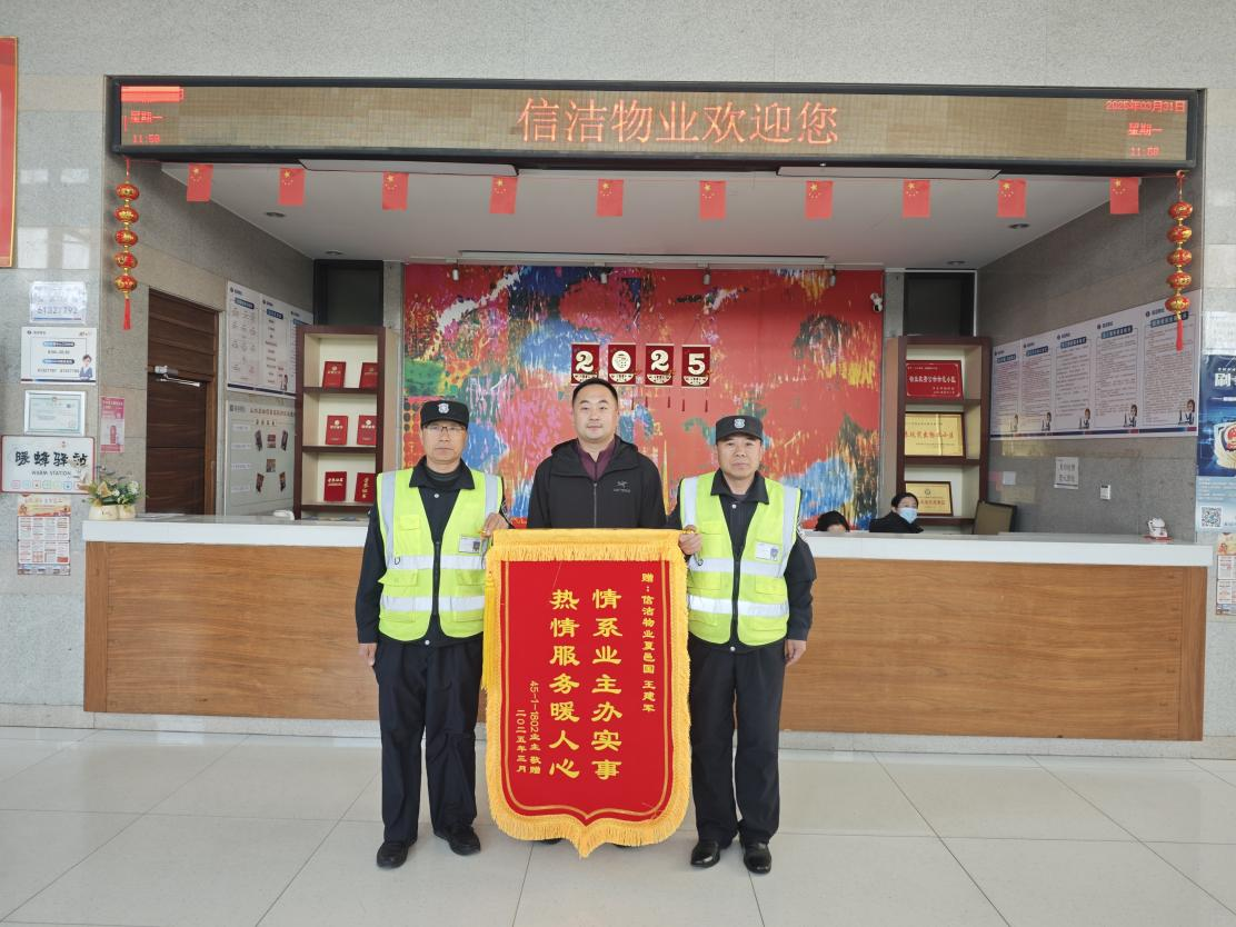 没过多久,业主满怀感激地定制了一面锦旗送到信洁物业山水泉城服务大厅。锦旗上,“情系业主办实事,热情服务暖人心”几个大字熠熠生辉。这面锦旗不仅是对夏邑国和王建军个人的高度赞扬,更是对信洁物业全体工作人员用心服务的认可。它象征着业主与物业之间深厚的信任与和谐的关系,激励着信洁物业在未来的日子里,继续以更饱满的热情、更专业的服务,为业主打造温馨美好的家园。(丘静然)