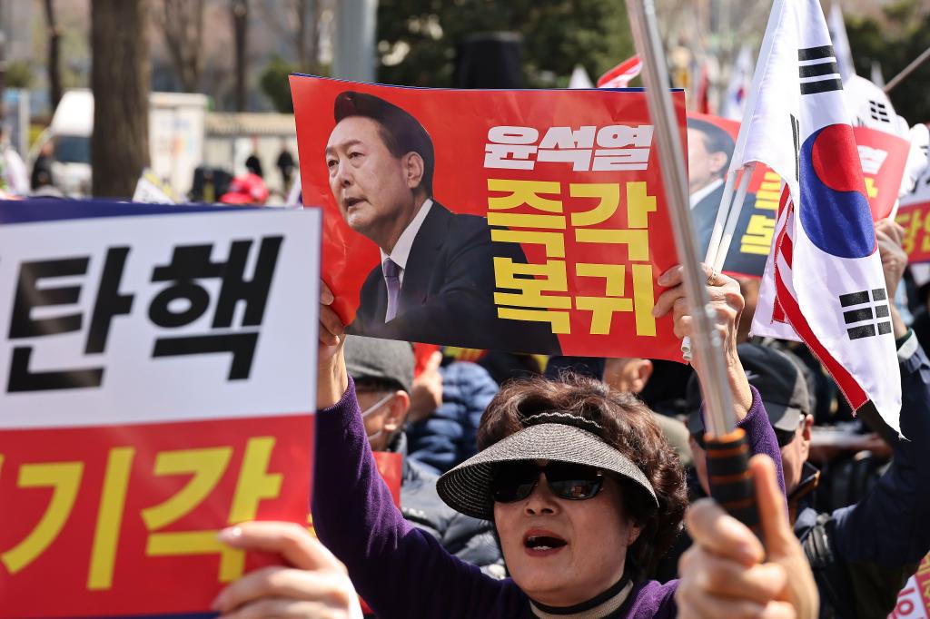 4月3日,在韩国首尔,人们在韩国宪法法院附近集会要求立刻罢免尹锡悦。牌子上写的是立刻罢免尹锡悦。