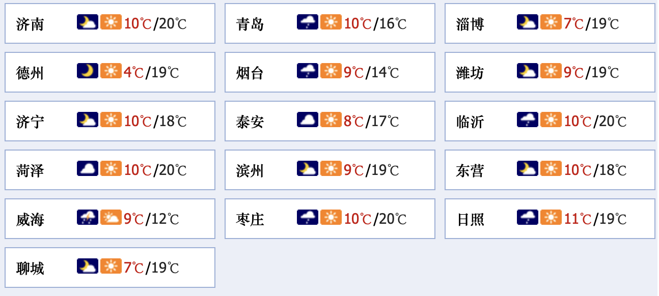 最高气温:鲁中山区和半岛地区14℃左右,鲁西北地区20℃左右,其他地区18℃左右。