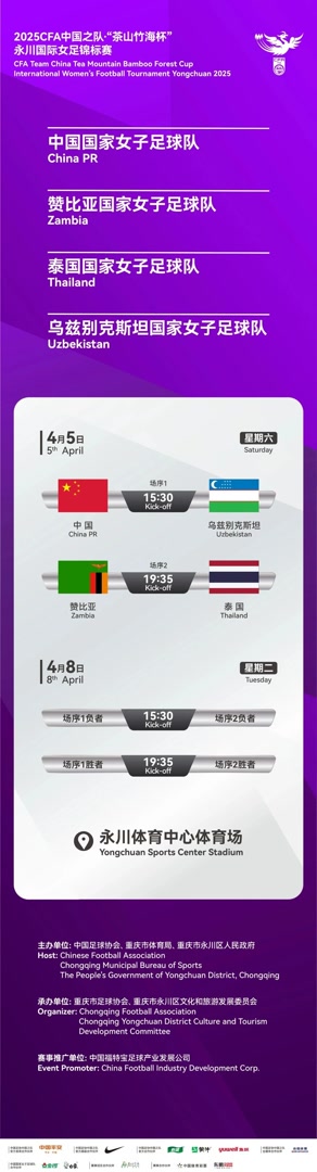 中国队和乌兹别克斯坦队的比赛后,赞比亚队和泰国队将进行本次永川国际女足锦标赛的第二场比赛。两场比赛的胜者将争夺赛事冠军,失败者则将争夺季军。这次永川邀请赛后,中国女足将在5月赴美与世界排名第一位的美国女足热身,然后在7月迎来东亚杯的比赛。算上今年2月在西班牙参加的皮纳塔尔杯比赛,中国女足今年在没有大赛的情况下安排了不少热身赛。