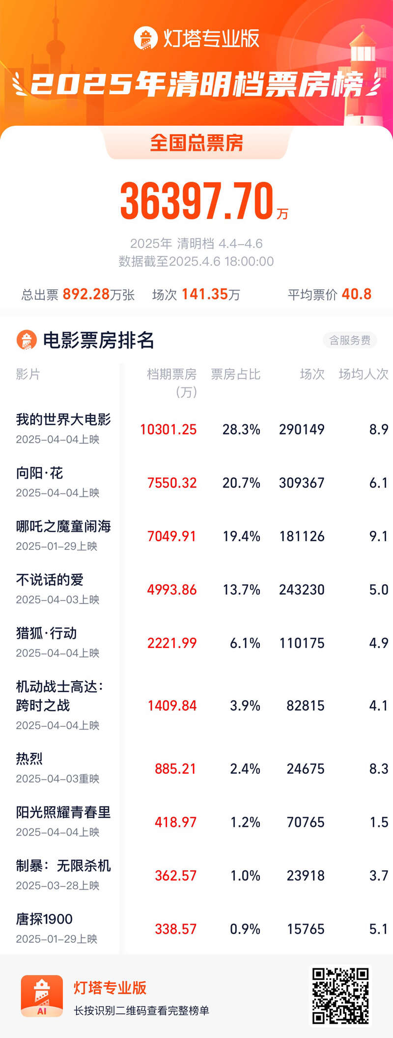 中国青年报客户端讯(中青报·中青网记者 沈杰群)截至4月6日18时,2025年清明档(4月4日-4月6日)电影总票房超3.6亿。