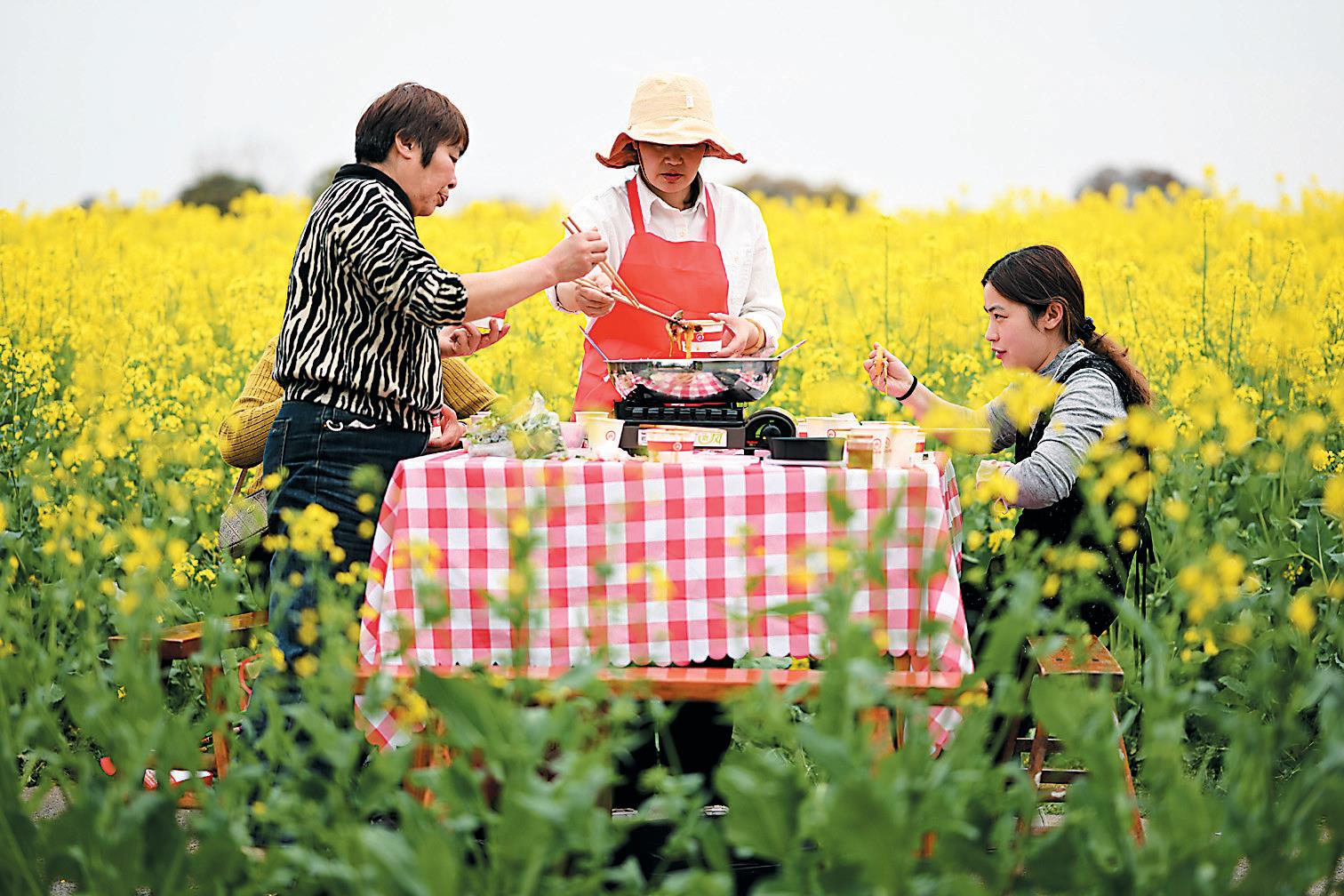 各地以花为媒,深挖“赏花经济”的内涵与外延,创造更多消费场景,持续释放消费活力。图为江苏南京,游客们在油菜花海中尽情享受火锅时光。(图片由CNSPHOTO提供)