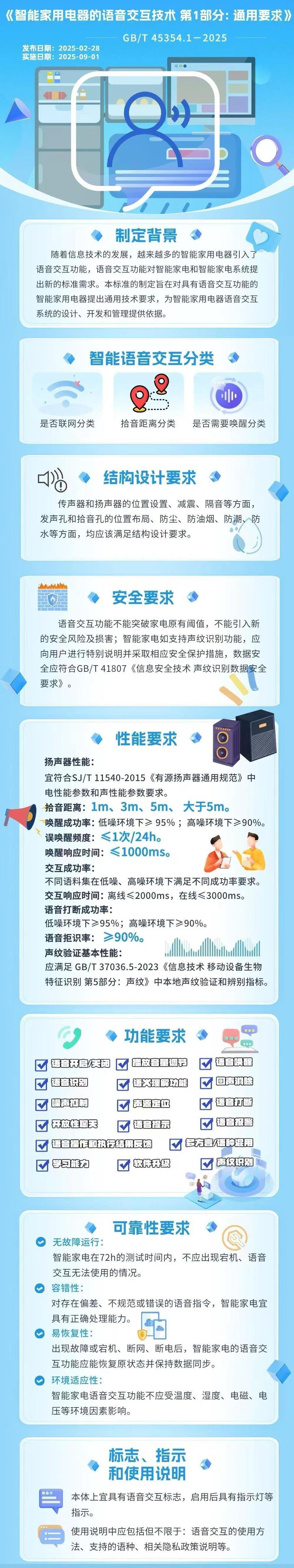 该标准对智能家电的语音交互功能进行了分类,明确了语音交互的框架结构,从结构设计、安全性、功能性、标注标识等方面提出技术要求。