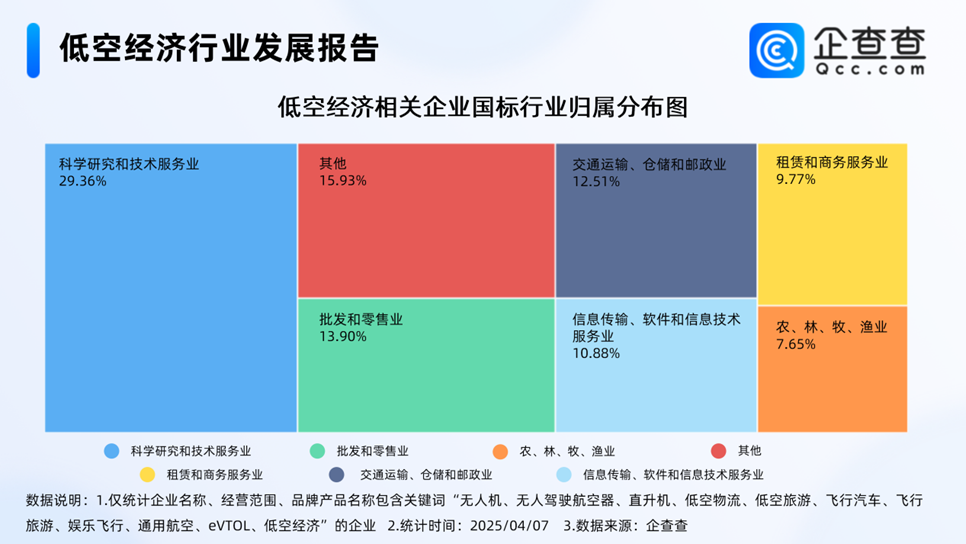 从国标行业来看,低空经济相关企业多归属于科学研究和技术服务业,占比29.36%。此外,相关企业广泛分布在批发和零售业,交通运输、仓储和邮政业,信息传输、软件和信息技术服务业等国标行业,分别占比13.90%、12.51%、10.88%。