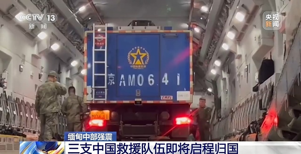 中国救援队伍完成缅甸地震救援任务启程回国 新华网 2025-04-09 1.0万 4月9日上午,赴缅甸开展地震救援的中国救援队、中国国际救援队和中国香港特区救援队完成国际救援任务,乘坐4架中国空军运-20飞机从内比都启程回国。 来源:央视新闻 行前,缅方在社会福利和救济安置部为中方救援队举办感谢仪式。缅甸国家管理委员会副主席梭温出席仪式并致感谢信。 缅甸外交部副部长伦乌、中国驻缅甸使馆临时代办曹静到机场送行。 (新华网) 责任编辑:王钟玉