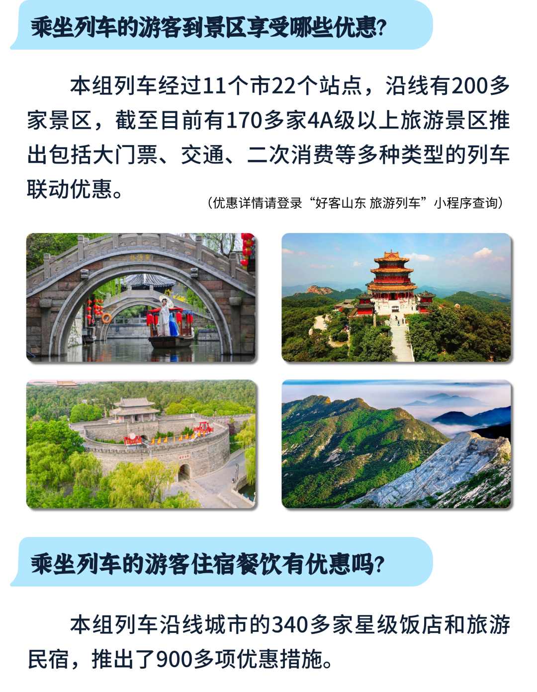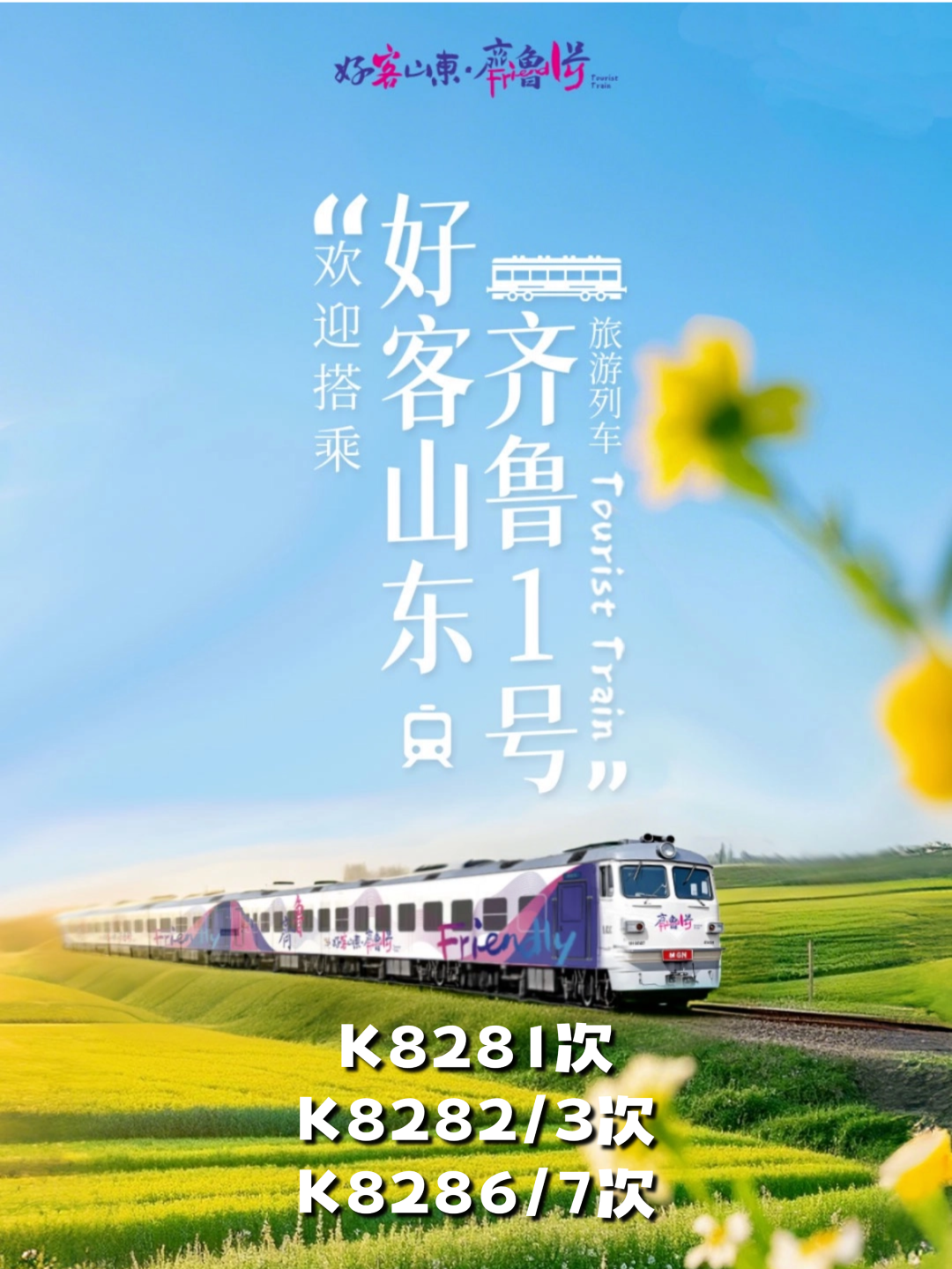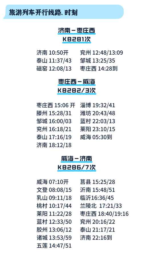 收藏!“好客山东·齐鲁1号” 旅游列车出行指南 大众报业·齐鲁壹点 2025-04-10 5265 “好客山东·齐鲁1号” 旅游列车已经 鸣笛启程啦! 沿线停靠哪些站点? 文旅元素有哪些? 特色美食又有哪些种类? 乘坐列车的旅客又能享受哪些优惠? 收下这份出行指南 解锁超多惊喜: “好客山东·齐鲁1号” 旅游列 车的亮点 相信你已全部get啦! 登上列车 ,一起去探索齐鲁大地, 开启一场 难忘旅程吧 ! (文旅山东) 责任编辑:张宇宁
